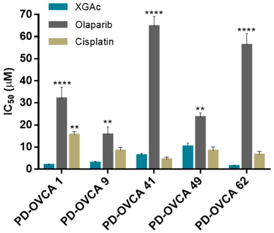 XGAc has a potent cytotoxic effect in patient-derived ovarian cancer cells (PD-OVCA). IC50 values of XGAc, olaparib and cisplatin in PD-OVCA cancer cells with pathogenic mutBRCA1 (PD-OVCA 1 and 9), benign mutBRCA1 (PD-OVCA 41) or wtBRCA1 (PD-OVCA 49 and 62), determined by MTS assay after 48 h of treatment. Data are mean ± SEM of five independent experiments; values significantly different from XGAc: ** p < 0.01, **** p < 0.0001 (two-way ANOVA followed by Dunnett’s test).