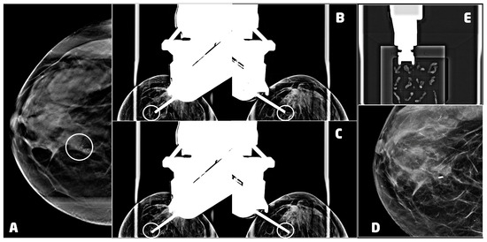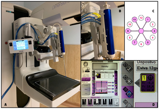 Once the patient is positioned with the best approach chosen in the planning phase and the breast is compressed, we perform the DBT to identify the target lesion (Figure 3A). The choice of the gauge and the aperture of the needle depend on the size, the position of the lesion, and the breast compressed thickness. In our department, we mostly use 9 G or 12 G needles with 20 mm or 12 mm apertures.
