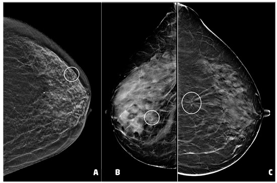 We performed a retrospective study following the STROBE guidelines (Table S1). We retrospectively analyzed the DBT-guided VABB procedures performed from 2019 to 2022 at our department. We exclusively enrolled female patients aged 40 and above, who underwent screening mammography in double projection (medio-lateral-oblique, MLO; cranio-caudal, CC) at our department and had a well-documented clinical history. Women with a pre-existing diagnosis of breast cancer and/or those who did not undergo the preliminary examination at our institution were excluded from the study. All patients with doubtful or positive findings at VABB (>B3) underwent surgery. For benign findings, we considered the available histopathology of the VABB or of the surgery, if performed.