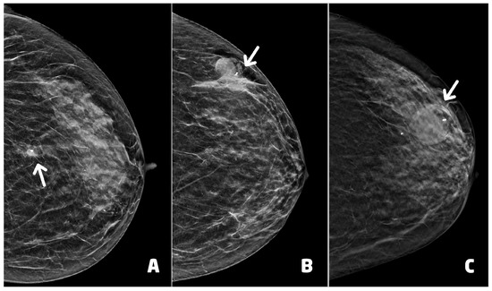 Conventional two-dimensional (2D) full-field digital mammography (FFDM) is considered the gold standard for early diagnosis in BC screening programs, but the potential overlap of tissue in dense breasts is a major limitation, because it can obscure an area of interest and lead to a false-negative finding [4]. In addition, the overlap of normal structures can create a pseudolesion, often called summation artifact, which drives to a false-positive result [5]. Digital breast tomosynthesis (DBT), based on the acquisition of a series of low-dose projection images, diminishes the masking effect of tissue overlap and structure noise usually found in 2D-FFDM, increasing cancer detection rates, and decreasing false-positive rates [6,7].