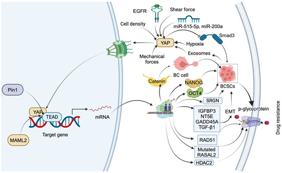 Summary of downstream targets of YAP that mediate drug-resistance mechanisms in TNBC. YAP nuclear translocation is facilitated by EGFR, miR-515-5p, miR-200a, mechanical forces, low shear force, hypoxia, and cell density. In the nucleus, YAP regulates BC cell transdifferentiation into BCSCs by inducing β-catenin expression through interaction with TEAD. YAP induces stemness by transcriptionally upregulating OCT4 and NANOG through interaction with their promoter regions. YAP1 promotes BCSC self-renewal by impeding Smad3 signaling. Exosomes from BC stem cells facilitate drug resistance by upregulating YAP. Pin1 increases drug resistance by stabilizing the YAP complex. YAP1 induces drug resistance and stemness by upregulating IGFBP3, NT5E, GADD45A, TGF-β1, RAD51, and RASAL2 and inducing p-glycoprotein-dependent drug efflux. YAP also triggers drug resistance and stemness by promoting the transcription of HDAC2.
