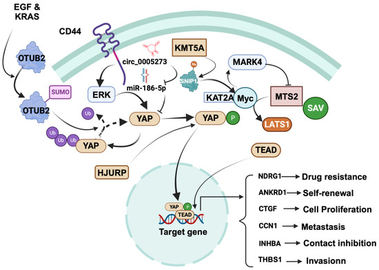 Regulation of cancer-promoting role of YAP in breast cancer. YAP promotes various cellular processes, including proliferation, contact inhibition, invasion, self-renewal, metastasis, and drug resistance. Focusing on specific mechanisms, YAP induces focal adhesion and invasion by driving TEAD-dependent transcription of thrombospondin 1 (THBS1). YAP is positively regulated by CD44, OTUB2, KMT5A, and circRNA hsa_circ_0005273, while it is negatively regulated by SYNPO2 and RICHI1. CD44 activation leads to ERK-mediated YAP phosphorylation, translocating YAP to the nucleus to upregulate ankyrin repeat domain 1 (ANKRD1), connective tissue growth factor (CTGF), cysteine-rich angiogenic inducer 61 (Cyr61/CCN1), and inhibin βA (INHBA). Further regulatory events, such as the SUMOylation of OTUB2 by EGF and KRAS and the stabilization of YAP in the cytosol through deubiquitination, come into play. KMT5A regulates YAP nuclear translocation by catalyzing K301 methylation of SNIP1, releasing histone acetyltransferase KAT2A, and enhancing the c-MYC/KAT2A complex’s recruitment to c-MYC target promoters. This complex activates MARK4, promoting MST2, SAV, and LATS1 phosphorylation, thereby promoting YAP’s nuclear translocation. HJURP affects YAP1 stability and distribution and subsequently binds to the NDRG1 gene promoter, upregulating NDRG1 transcription. Notably, circRNA hsa_circ_0005273 upregulates YAP expression by counteracting miR-186-5p’s tumor-suppressive activity. The figure was created with BioRender.com.