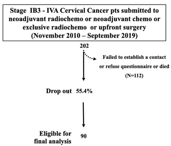 During the study period, 202 LACC patients received NART/CT, NACT, ERT/CT, or UPS in the five institutions. We attempted to contact all patients with a telephone call, but 112 women (55.4%) refused or did not respond to phone calls or died during the time of the study. Therefore, the final analysis was conducted on a study population of 90 (44.5%) women (Figure 1).