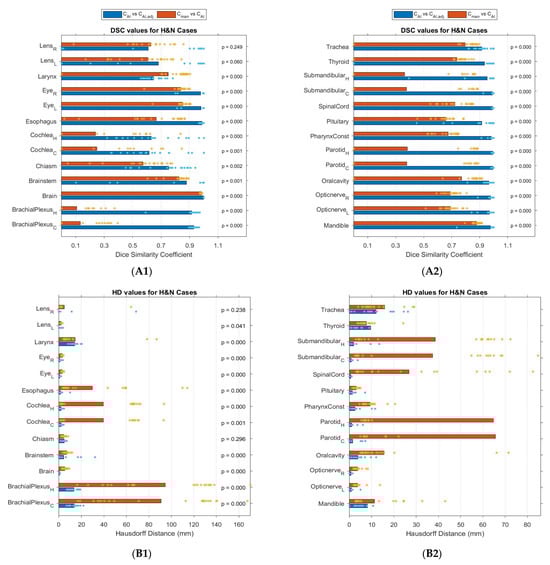 In comparison to AI-based CAI,adj contours, most of the structures of HNC cases, including the brain, mandible, eyes, and optic nerves, had a high degree of geometric correlation (DSC > 0.98, HD < 3.32 mm, and RVD near to 0). However, there were also structures with low DSC, such as the brachial plexus (DSC = 0.11–0.13), leading to a large variety of results, which is consistent with the previous literature [6,11]. The institutional recommendation to contour a larger larynx, for instance, may result in a poorer geometric correlation of this OAR. Moreover, for this study, the autocontouring software and the oncologist utilized only CT images without contrast enhancement for contouring and revision, while normally, ROs register MRI images to CT images for contouring the OARs.