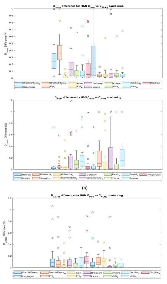 Differences in Dmean to OARs for HNC between Cman and CAI,adj contours are shown in Figure 8a, where the esophagus exhibited relatively large variations in ∆Dmean. D0.03cc to the eyes and cochleas had a difference of a maximum of 13% between the Cman and CAI,adj plans (Figure 8b), while other OARs showed <10% differences, except for the constraint of contralateral brachial plexus and brainstem. Each circle symbol represents a value outside the standard deviation.