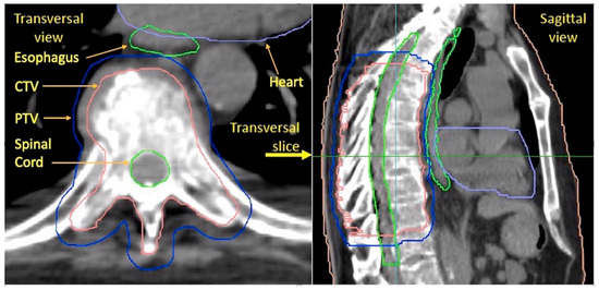 The clinical target volume (CTV) included the affected vertebrae in full and, in some cases, also the medial part of an affected costa (Figure 1). The planning target volume (PTV) was generated by applying a uniform margin of 0.5 cm in the anterior–posterior and lateral directions and a margin of 1 cm in the superior–inferior direction to the CTV. The OARs delineated were the heart, esophagus, lungs, and spinal cord (Figure 1). The esophagus was delineated from the cricoid to the gastroesophageal junction. The heart was delineated from the origin of the coronary vessels in the cranial direction down to the apex in the caudal direction and included the pericardium. The spinal cord encompassed the extension of the PTV in the axial direction, plus an extra margin of 2 cm in both the inferior and superior borders of the PTV. The lungs were delineated as a single OAR, i.e., the total lung volume (lung total). A representative CTV/PTV and OAR delineation is illustrated in the transversal and sagittal views in Figure 1 [patient #27].