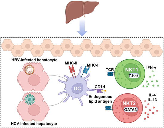 Invariant Natural Killer T cells (iNKTs) in liver infectious diseases. In hepatitis virus infections, infected hepatocytes are phagocyted by antigen-presenting cells (APCs), such as dendritic cells, which present lipid antigens loaded on CD1d molecules to activate NKT cells in a TCR-dependent manner. In this context, iNKT cells typically mount an NKT1 response after activation. However, during HBV infection, iNKTs may also respond by secreting IL-4 and IL-13 cytokines, which have been linked to the type 2 CD4+ T helper cell-like phenotype NKT2. Figure created with BioRender.com.