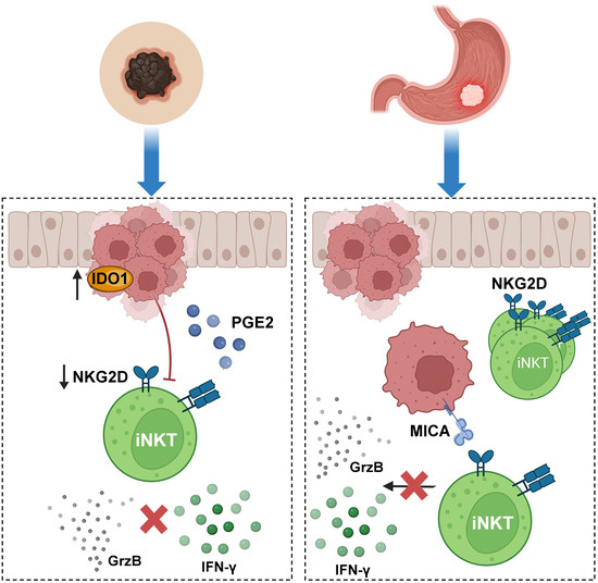 iNKT cells display reduced function in melanoma and gastric cancer. In a scenario related to melanoma, iNKT cell function has been reported to be suppressed in the tumor microenvironment due to cancer cells overexpressing IDO1 and secreting PGE2. Culturing iNKT cells with melanoma cell lines causes a significant reduction in the expression of the NKG2D receptor, negatively affecting the proliferation of these cells and their cytotoxic response against tumors. iNKT anti-tumoral function is also inhibited in gastric cancer (GC). In individuals with GC, the frequency and number of iNKT cells in peripheral blood are increased; however, in functional cytotoxicity assays in which iNKT cells were stimulated through the NKG2D receptor and not CD1d, these cells displayed reduced granule release and poor IFN-γ production. Figure created with BioRender.com.