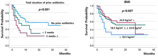 Overall survival according to the total duration of prior antibiotics and BMI.