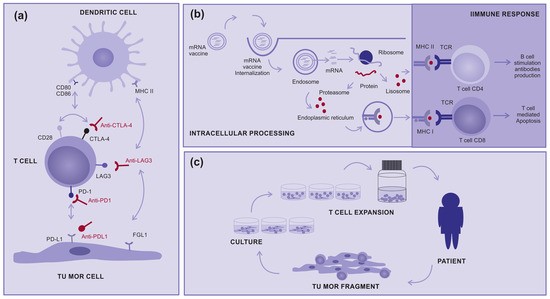There are also clinical studies on other types of immunotherapies such as therapeutic mRNA vaccines, which induce the production of tumoral immunogenic proteins by antigen-presenting cells and the control of T-cell stimulation (Figure 1b). In addition, there are tumor-infiltrating lymphocytes (TILs), in which T cells are removed from inside tumors and “in vitro” expanded to return activated to patients in very high numbers (Figure 1c). Both treatments are promising modalities for advanced cutaneous melanoma, either alone or in combination with other therapies [9,23,24,25,26].