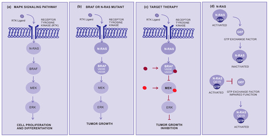 Targeted therapy is another important approach for the treatment of advanced cutaneous melanoma. This therapy inhibits specific molecules or signaling pathways. The mitogen-activated protein kinase (MAPK) cascade is an intracellular signaling pathway implicated in cell proliferation and survival regulation (Figure 2a) [31,32,33]. Several different mutations, involving BRAF or N-RAS, display an oncogenic effect by activating the MAPK pathway (Figure 2b), resulting in increased tumor cell proliferation [34]. The BRAF mutations are mainly in BRAF-V600E (~80%) and BRAF-V600K (~5 to 30%), which cause alteration of the protein that participates in the MAPK/ERK signaling pathway (Figure 2b,c) [34].