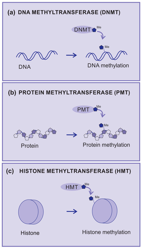 Methyltransferases. (a) DNA methyltransferase (DNMT) is an enzyme that transfers radical methyl to DNA nucleotides, (b) protein methyltransferase (PMT) is an enzyme that transfers radical methyl to protein amino acids, (c) histone methyltransferase (HMT) is an enzyme that transfers radical methyl to histones.