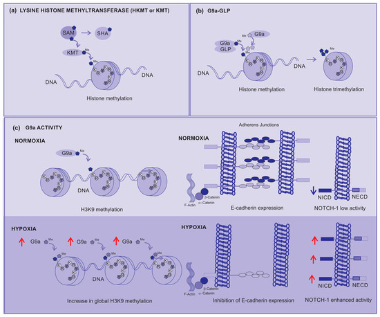 Lysine Histone Methyltransferases (KMTs) (a) KMT transfers a methyl from a donor (SAM) to the histone, (b) the G9a-GLP complex is responsible for the mono-methylation of H3K9 histone, but G9a is responsible for the di- and tri-methylation of H3K9. (c) G9a activity under normoxia contributes to the prompt di-methylation of H3K9, but under hypoxia it increases the global di-methylation of H3K9, silencing the gene responsible for E-cadherin expression, affecting the adhesion between cells, contributing to metastasis, and activating the Notch-1 signaling pathway which contributes to cancer cell survival and proliferation. Red arrows—up arrow is an indicative of upregulation.