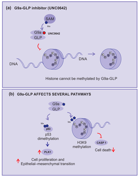 G9a–GLP is implicated in several mechanisms and pathways, including inhibition of the expression of the caspase 1 gene (CASP1) by enhancing the H3K9me2 of the promoter region. In addition, G9a can di-methylate p53, inhibiting its activity and enhancing the expression of polo-like kinase 1 (Plk1), which has been implicated in cell proliferation and epithelial–mesenchymal transition (Figure 5b) [74].