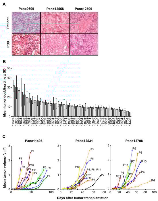 Histological features and growth characteristics of the PDAC PDX models. (A) Comparison of the histology of the primary patient tumor tissues (upper panel) and of the corresponding PDX tissues (lower panel) in H&E-stained tissue slices. Magnification: 40×. (B) Mean tumor doubling times (TDTs) of all 45 PDAC PDX models showing high range of the TDT for these models ranging from 5 days to up to >30 days. Values represent means of 2 to 6 measurements with respective SD values. n = 5 mice. (C) Alterations in TDTs shown for three representative PDAC PDX models during consecutive passages (from passage P1 up to passage P12), indicating accelerated PDX growth with increasing passage number on mice. n = 3 to 5 mice.