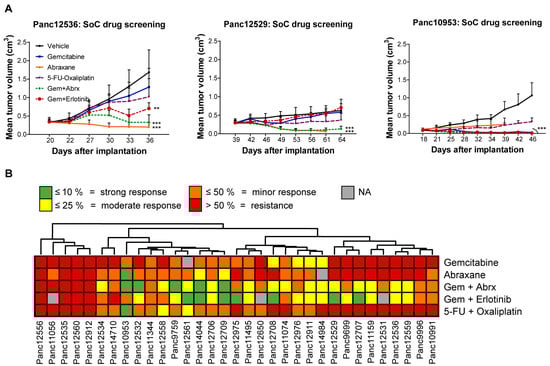 Sensitivity testing of PDAC PDX models toward SoC drugs in subcutaneous setting. (A) Mean tumor volume of s.c. PDX models during and after treatment with various SoC drugs (gemcitabine, abraxane, 5-FU, oxaliplatin) and one targeted drug (erlotinib), as well as drug combinations (gemcitabine/erlotinib; gemcitabine/abraxane; 5-FU/oxaliplatin). Tumor growth was monitored regularly from day 20 to 54 and the tumor volume was determined; n = 5 mice per group. Three representative PDX models (Panc12536, Panc12529 and Panc10953) with different levels of sensitivity toward drug treatment are shown, reflected by changes of mean tumor volumes. (B) Unsupervised clustering of PDAC PDX models according to categorized T/C response rates of the individual treatment regimens is showing sensitivity and resistance characteristics for all PDX models. ** p < 0.01, *** p < 0.001.