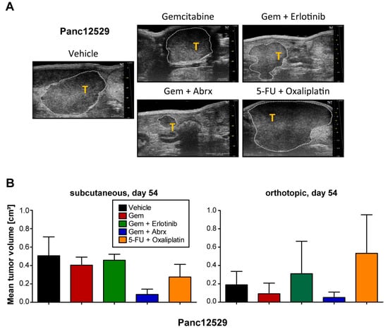 Comparison of treatment responses in subcutaneous and orthotopic settings. (A) Tissue samples of the PDAC PDX model Panc12529 were transplanted orthotopically, receiving the above-mentioned treatment regimen. Measurement of tumor volumes in the orthotopic setting by using ultrasound measurements of tumors (T) within the pancreas of mice and respective calculation of tumor volumes with software VevoLAB 2.2.0. (B) The resulting tumor volumes in both settings are given as mean tumor volumes + SD.