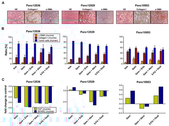 Therapy response of PDAC tumors is strongly influenced by its stromal content. Since we observed similar histomorphological characteristics of human PDAC tumor tissue and its corresponding PDX model, we were interested in if and how the stromal composition is altered during various treatment regimens. IHC analyses of murine collagen I and α-SMA show strong protein expression of the cancer-associated fibroblast (CAF) markers in the PDX tumors, indicating full replacement of the human stroma with mouse stroma (Figure 4A).