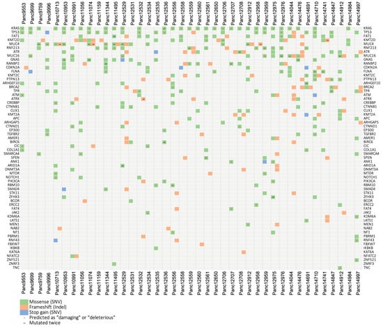 Since the gene set enrichment analysis of RNAseq data revealed a quite differentiating picture of the expression of DNA damage repair pathways in our pancreatic cancer models, we additionally selected 39 genes playing a major role in six DDR pathways for a mutational analysis [60,61] (Figure S6, Table S2).