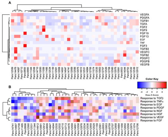 As mentioned above, the tumor stroma in patient PDAC tumors has a significant impact on the potential response during anti-cancer therapies. Taking into account that the tumor cells themselves can shape the murine stroma into a tumor supporting environment, we determined the expression pattern for various human growth factors to stimulate stromal response (Figure 6A). Unsupervised clustering of growth factor expression by human tumor cells showed vascular endothelial growth factors (VEGFs) A, B and C as the strongest differentiators within the cohort, potentially stimulating stroma-driven angiogenesis. In turn, we compared potential responses in the human tumor cells to (growth) factors released by the murine tumor stroma (Figure 6B), indicating clusters of models responsive or rather inert to stromal signaling.