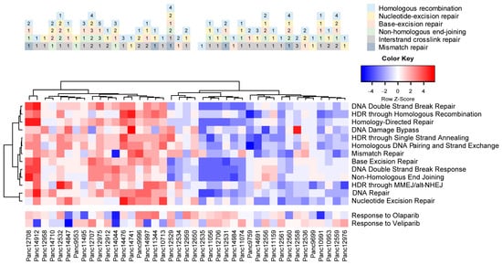 As indicated by the mutational characteristics of the PDAC PDX cohort, we found a variety of mutations (SNV, frame shift) in proteins associated with DNA damage repair pathways (Figure S6). We also analyzed the potential activity or deficiency of individual repair pathways, like homologous recombination (HR), base and nucleotide excision repair (BER and NER, respectively), non-homologous end joining (NHEJ) and mismatch repair (MMR). We observed enriched gene sets of DNA repair pathways in almost half of the cohort, indicating higher actual DNA damage repair activity in those models (Figure 7). A similar analysis of the transcriptomes also allowed for scoring each model for enriched gene sets associated with cellular response to olaparib and veliparib, indicating potential response of the PDX models to a treatment with PARP inhibitors.
