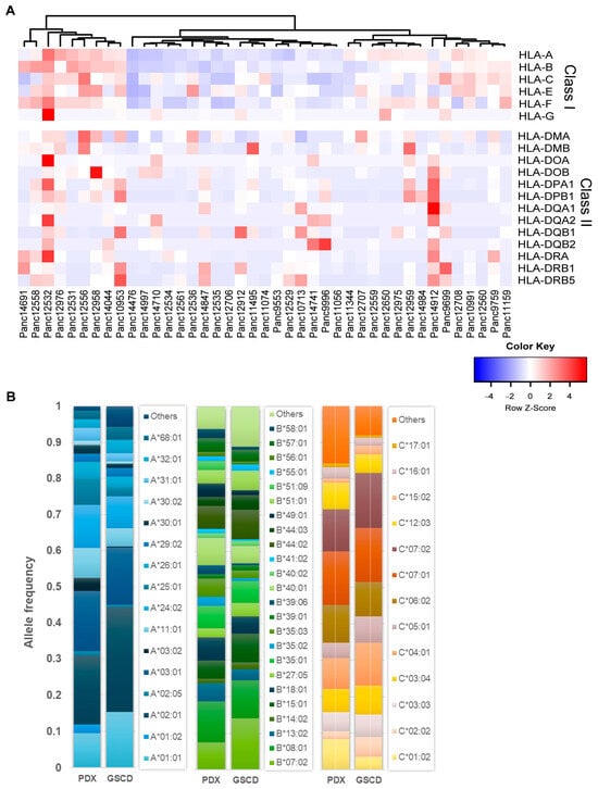 Preclinical in vivo studies of immune efficacy on PDX tumor growth are often hamstrung by unspecific allograft reactivity of applied immune cells. One way to overcome this hurdle is to find HLA-compatible tumor/immune models, in which a specific anti-tumor response of the immune cells can be modulated by immune enhancers or checkpoint inhibitors. HLA typing of 41 PDAC PDXs and the comparison with the HLA profiles of 8862 GSCDs indicated that our panel can reflect the HLA allele distributions of a large, representative cohort. Among other factors, the obtained variations in the determined alleles and frequencies could be attributed to differences between a healthy population and patients with PDAC. Actually, differences in the expression of certain HLA genes can serve as prognostic markers. For example, higher expression of HLA-A, -B, -C, -E and -G on PDAC cells has been associated as a prognostic marker for shorter survival of the respective cells [92]. In immune–oncology research, comprehensive HLA profile portfolios, similar to ours, provide important information for the generation of humanized mouse models. HLA profile matching of mutually compatible PDX models and human immune cell populations enables personalized, preclinical studies to promote the development of new immune–therapeutic strategies. In turn, comprehensively characterized PDX cohorts are invaluable tools for translational research, as they simulate the patient diversity in clinics.