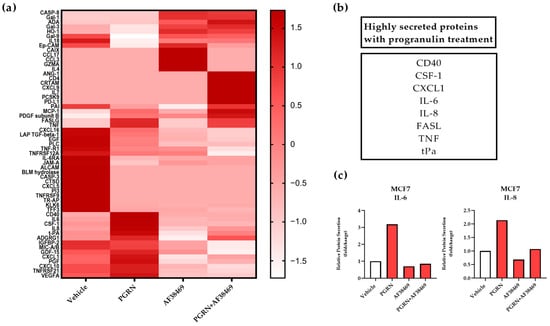 Progranulin treatment increased IL-6 and IL-8 secretion in breast cancer cells. (a) Heat map showing secreted proteins and cytokines in MCF7 cells. Cells were untreated (vehicle), treated with 1 μg/mL progranulin or 2 μg/mL AF38469, or a combination, for 48 h. The data are auto-scaled, and each protein is normalized to the total secretion of each sample. (b) Table of highly secreted proteins with progranulin treatment. (c) Bar charts illustrate the relative fold changes of IL-6 and IL-8 after progranulin treatment in MCF7 cells. Data represent one biological replicate. PGRN: progranulin, IL: interleukin.