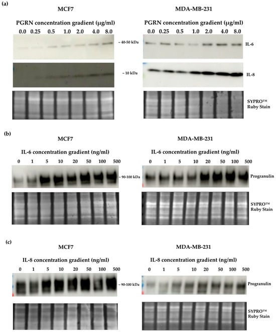Crosslink between progranulin and IL-6 expression in breast cancer cell lines. Immunoblotting of IL-6, IL-8 and progranulin protein expression in MCF7 and MDA-MB-231 breast cancer cell lines. (a) Cells treated with increasing concentrations of progranulin showed an increase in IL-6 and IL-8 expression for 48 h. Treatment with an IL-6 (b) or IL-8 (c) concentration gradient led to an increased progranulin expression in MCF7 and MDA-MB-231 cells. SYPRO™ Ruby (Bio-Rad) stain was used as a loading control. Representative images from one of three independent experiments are shown. Western blot data are cut for visualization purposes, and all samples for the respective antibody were analyzed on the same blot. PGRN: progranulin, IL: interleukin. The uncropped bolts are shown in Supplementary Materials.