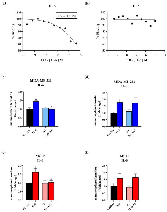 The progranulin receptor sortilin has recently been identified as a high-affinity receptor for IL-6 [20]. To confirm the binding of IL-6 to sortilin, we performed a competitive binding assay for sortilin using a fluorescence polarization-based method. The results confirmed that IL-6 binds to sortilin by outcompeting the fluorescently labeled neutrotensin, with an IC50 of 11.2 µM (Figure 3a). In contrast to IL-6, IL-8 did not outcompete neurotensin, suggesting that IL-8 does not bind to sortilin, or at least not to the same binding site (Figure 3b). Further, to investigate whether the cancer stem cell expansion triggered by IL-6 and IL-8 was dependent on sortilin, the small sortilin-binding molecule AF38469 was used [26]. MCF7 and MDA-MB-231 cells were treated with IL-6 and IL-8, alone or in combination with AF38469, for 48 h before performing the mammosphere assay. As expected, treatment with IL-6 alone increased the mammosphere capacity of the cell lines. However, when combined with AF38469, there was a reduction in sphere formation for both MCF7 and MDA-MB-231 cells (Figure 3c,e). In contrast, AF38469 did not influence the IL-8-induced mammosphere increase (Figure 3d,f). These results demonstrate that sortilin is required for IL-6- but not IL-8-dependent breast cancer sphere formation in vitro.