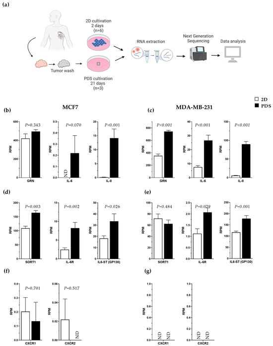 Expression profile of interesting cytokines, proteins and receptors of breast cancer cells grown in 2D monolayer cultures compared to patient-derived scaffolds (PDS). (a) Schematic picture showing experimental workflow for next-generation sequencing (NGS) analysis of 2D monolayer cultures (MCF7and MDA-MB-231) compared to PDS cultures (MCF7 and MDA-MB-231). Results indicate transcriptional activation of genes in the PDS (3D) system compared to 2D using MCF7 and MDA-MB-231 cells by performing NGS. Bar plots show an increase in expression of progranulin (PGRN), IL-6 and IL-8 in 2D cultures compared to PDSs in (b) MCF7 and (c) MDA-MB-231. Differences in gene expression of relevant receptors in 2D cultures compared to PDSs in (d,f) MCF7 and (e,g) MDA-MB-231 cells. RPM—reads per million, SORT1 (sortilin receptor—ENSG00000134243.7), GRN (progranulin—ENSG00000030582.12), IL-6 (interleukin-6—ENSG00000136244.7), IL-6R (IL-6 receptor—ENSG00000160712.8), IL-6ST/GP130 (IL-6 signal transducer (also called GP130—glycoprotein 130)—ENSG00000134352.15), IL-8 (interleukin-8—ENSG00000169429.6), CXCR1 (chemokine (C-X-C motif) receptor 1/IL-8 receptor 1—ENSG00000163464.7), CXCR2 (IL-8 receptor 2—ENSG00000180871.3), ND—not detected. Statistical significance was calculated using an unpaired t-test (PDSs, n = 3 and for 2D, n = 6 for both cell lines).