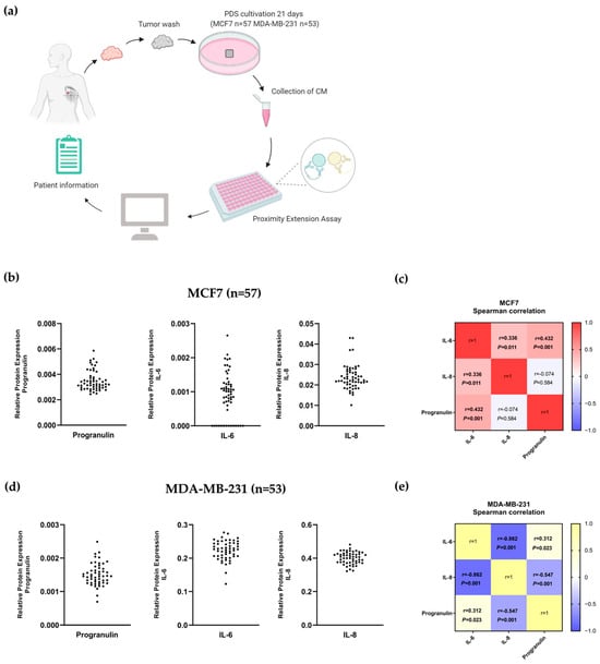 Correlation between secreted IL-6, IL-8 and progranulin in the PDS model system. (a) Schematic picture showing experimental workflow for secretome analysis of breast cancer cells grown in PDS. (b) Dot plots of the variation in secretion of progranulin, IL-6 and IL-8 for cancer cells grown in the PDS model in MCF7. (c) Heat map visualization of pairwise Spearman correlation between different markers in MCF7 cells grown in the PDS culturing system. (d) Dot plots of the variation in secretion of progranulin, IL-6 and IL-8 for cancer cells grown in the PDS model for MDA-MB-231. (e) Heat map visualization of pairwise Spearman correlation between different markers in MDA-MB-231 cells grown in the PDS culturing system. The data represent MCF7 or MDA-MB-231 cells cultured in PDSs generated from 63 different breast cancer patients (57 for MCF7 and 53 for MDA-MB-231 cells), corresponding to 122 individual samples. p < 0.05 is considered statistically significant. PDS: patient-derived scaffold, r: correlation coefficient, IL-6: interleukin-6, IL-8: interleukin-8, CM: conditioned media.