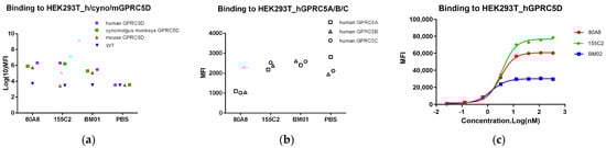 Monoclonal antibodies against GPRC5D were obtained by immunizing fully humanized mice with human GPRC5D. Subcloned hybridoma cells were screened both positively and negatively. As shown in Figure 1a, 80A8, one of the positive clones, had similar species-binding properties to positive reference BM01, and they all clearly showed binding to hGPRC5D/cynoGPRC5D/mGPRC5D. Another clone, named 155C2, also showed a binding activity with hGPRC5D/cynoGPRC5D that was similar to that of 80A8, but the difference was that it did not bind to mGPRC5D. In terms of specificity, neither 80A8 nor 155C2 bound to human GPRC5A, GPRC5B, or GPRC5C (Figure 1b).
