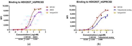Both BR109 and BM03 had binding arms that could simultaneously recognize human GPRC5D and human CD3ɛ. As shown in Figure 2a, BR109 recognized HEK293T_hGPRC5D about two times better than positive reference BM03, with EC50 values of 3.207 nM and 7.079 nM, respectively, while negative reference IsotypeCD3 did not recognize HEK293T_hGPRC5D at all. Meanwhile, BR109 showed a slightly stronger binding activity than talquetamab analog (Figure 2b). The EC50 values were determined as 2.255 and 3.696 nM, respectively. When the bound TCBs reached a saturation plateau, 80A8 had higher MFI values than BM03 and talquetamab analog.