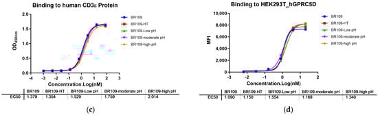 The binding activities of anti-GPRC5D × anti-CD3 TCBs with HEK293T_hGPRC5D were determined by flow cytometry assay and were plotted as MFI. (a) BR109, negative control IsotypeCD3, and positive control BM03; (b) BR109, negative control IsotypeCD3, and positive control talquetamab analog. The binding activities of BR109 with various accelerated treatment conditions with human CD3ε protein and HEK293T_hGPRC5D cells; (c) was graphed using OD450nm; (d) was graphed using MFI. Data are shown as mean ± SD (n = 3/group).