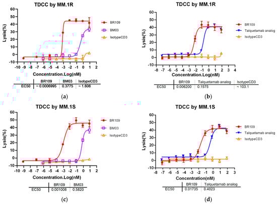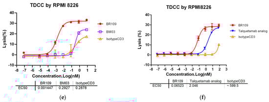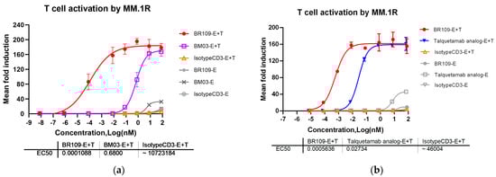 In the in vitro T cell activation assay, the signal intensity detected by the microplate reader was directly proportional to the intensity of CD3 activation and signal transduction. As shown in Figure 3a,b, BR109 and positive control BM03 and talquetamab analog were all capable of inducing the activation of the Jurkat/NFAT-Luc cells 4E2 in a dose-dependent manner, while, with the negative control molecule in the presence of IsotypeCD3, no obvious activation signal was obtained. The BR109 molecule had the strongest specific activation effect, which was significantly better than that of BM03 and talquetamab analog, respectively. From the data point of view, the EC50 values of BR109 were three or two orders of magnitude lower than those of BM03 or talquetamab analog. Non-specific T cell activation was performed in the presence of BM03 or talquetamab analog with concentrations above 0.8 nM, but BR109 could specifically activate T cells only in the presence of MM tumor cells.
