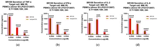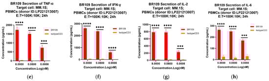 Moreover, to provide evidence that anti-GPRC5D × anti-CD 3 TCBs triggered T cell activation, but those others did not, the levels of the secreted cytokines in the supernatants of BR109 or IsotypeCD3 were added to cocultures of GPRC5D-expressing MM.1R or MM.1S cells and human PBMCs (donor ID: LP221213007) during the TDCC tests. Compared with negative control IsotypeCD3, BR109 treatment led to the obvious and concentration-dependent secretion of TNF-α, IFN-γ, IL-2, and IL-6, consistent with T cell activation and T-cell-mediated cytotoxicity (Figure 5).