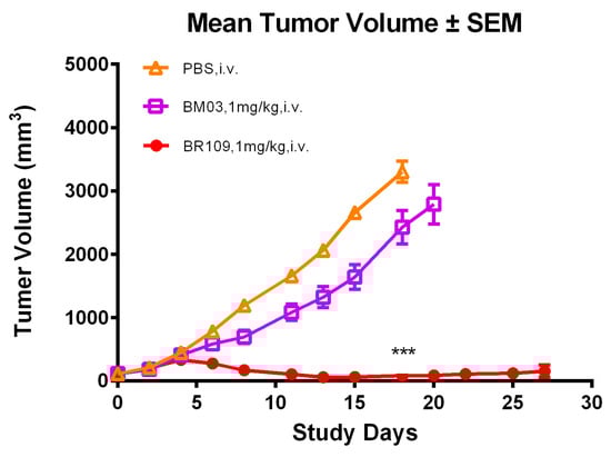 Antitumor activity of BR109 and positive control BM03 against multiple myeloma cell line H929 in NPG mouse models with human PBMCs (donor ID: DZ211314). Parametric Dunnett test: *** p < 0.001, versus PBS treatment at day 18.