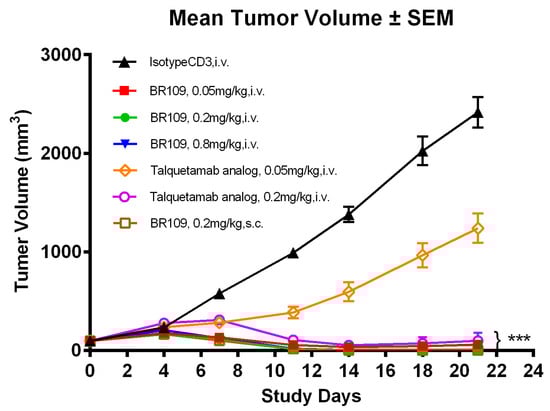 Antitumor activity of BR109 and positive control talquetamab analog against multiple myeloma cell line H929 in NPG mouse models with human PBMCs (donor ID: DB21216). Parametric Dunnett test: *** p < 0.001, versus IsotypeCD3 treatment at day 21.