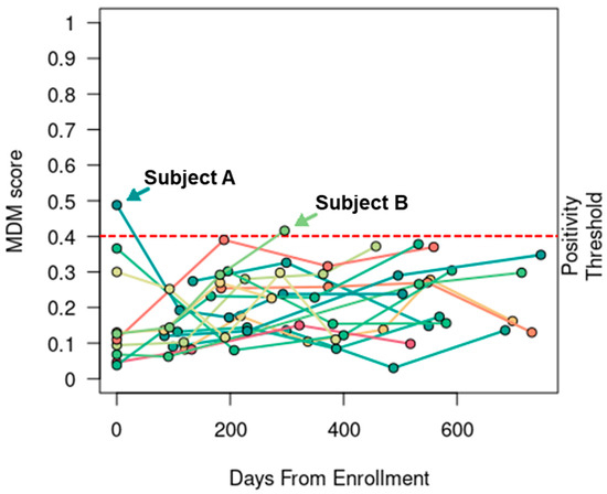 MDM score was specific. In 17 patients without evidence of recurrent CRC, the serial MDM scores were only positive at a single timepoint in two patients (A and B). Both patients eventually developed recurrent disease beyond the study period.
