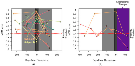 MDM score was sensitive. (a) Serial MDM scores detected recurrence (emphasized with dark gray plot shading) in 16 out of 18 patients except for Patient C (peritoneal recurrence) and D (isolated lymph node recurrence). MDM scores pre- (○), post- (◊), and at the time of clinical or radiographic detection of recurrence (∆) are shown. MDM scores 150 days before and after recurrence are emphasized with light gray plot shading. (b) Following locoregional therapy for recurrent CRC (shaded in purple), the MDM score decreased in three patients. Dark gray plot shading at the time of recurrence is widened (+/− 15 days) to visually stagger ∆ markers with similar MDM scores.