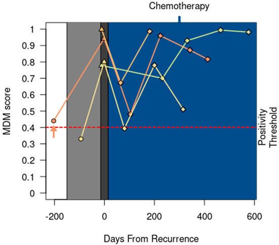 MDM score detected recurrence at the same time as clinical or radiographic detection of recurrent CRC in four patients. One patient (↑) entered the study while receiving chemotherapy for lung recurrences; this patient completed locoregional therapy before starting surveillance. All patients started chemotherapy following clinical recurrence (shaded in blue). MDM scores 150 days before recurrence are emphasized with light gray plot shading. Dark gray plot shading at the time of recurrence is widened (+/− 15 days) to visually stagger ∆ markers with similar MDM scores. Patient status timepoint annotations include surveillance (○), recurrence (∆), and receipt of palliative chemotherapy (◊).
