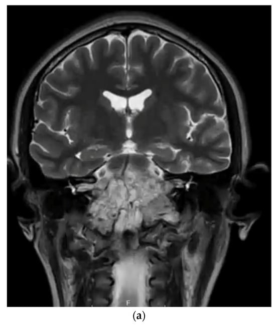 (a) T2-weighted MRI coronal sequence demonstrating the characteristic hallmarks of a clival chordoma, T2 hyperintensity within the skull base lesion. (b) T1-weighted MRI post-contrast sagittal sequence demonstrating anatomical boundaries of a clival chordoma with ventral brainstem compression. (c) T1-weighted MRI post-contrast sagittal sequence demonstrating gross total resection via endoscopic endonasal approach of clival chordoma.