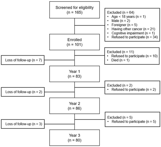 This is a secondary analysis of a longitudinal study [19] that examined the association between coping style at diagnosis and subsequent QOL for 3 years among BCSs. Included were women aged ≥19 years who had received a first-time diagnosis of breast cancer within 1 month, had a plan for cancer treatment, and were able to read and write Korean. Women were excluded if they had other cancer(s), had cognitive impairment, or were already undergoing cancer treatment. We screened 165 women and enrolled 101. The retention rate was 82.2% (n = 83) at 1 year after enrolment (‘Year 1’), 85.1% (n = 86) at 2 years after enrolment (‘Year 2’), and 79.2% (n = 80) at 3 years after enrolment (‘Year 3’). A detailed participant flow is presented in Figure 1.