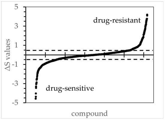 To further prioritize compounds for a more in-depth follow-up, we selected compounds that generated concentration–response curves with an average R2 of at least 0.8 in all four test cell lines. R2 values from the reference cell line were similarly set to at least 0.8, and compounds that did not meet this threshold were excluded from the prioritized list, except for cases where there was no concentration–response. For the compounds meeting prioritization criteria, the ΔS mean and ΔS variance of the mean were calculated. Compounds displaying drug resistance (ΔS mean > 0.5) or drug sensitivity (ΔS mean < −0.5) were considered potentially biologically meaningful, as they would represent approximately a 3-fold change on an arithmetic scale (Figure 1). An additional threshold of 0.3 was set for the lower boundary of variance of the mean to ensure that the mean values were at least non-inferior to a null response. Non-inferiority can be shown if the difference between the two treatments does not cross a predefined inferiority margin. A threshold of 0.3 would represent approximately a 2-fold difference in an arithmetic scale.