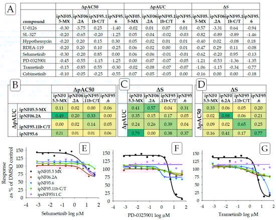 ((A) Top panel) Drug sensitivity of the plexiform neurofibroma cell lines to MEK inhibitors, determined using ΔpAC50, ΔpAUC, and ΔS, wherein ipnNF95.11C was used as the reference cell line. We compare ΔS to ΔpAC50 and ΔpAC50, which are frequently used indicators of relative potency. Drug sensitivity responses are negative ΔS values. ((B–D) Middle panel) Strength of the relationship of ΔS to ΔpAC50 and ΔpAUC was examined using the square of Pearson’s product-moment correlation coefficient “r” for each pair of cell lines and with color scales applied. The bright green color indicates a high correlation for the relationship, and yellow indicates a low correlation. ((E–G) Bottom panel) Also see graphs that illustrate concentration–response curves for three MEK inhibitors showing drug sensitivity: (E) selumetinib, (F) PD-0325901 (mirdametinib), and (G) trametinib. Purple is used to indicate data from the reference non-tumor cell line, ipnNF9511.C. Note how the concentration–response curves that are shifted below the respective reference lines indicate a relative sensitivity for MEK inhibitors.
