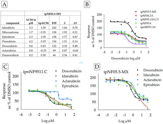 In contrast to compounds inducing sensitivity, ipNF05.5-MX cells showed resistance to a panel of TOP2A inhibitors, compared to the response of the control ipnNF95.11C cell line (Figure 3). Furthermore, drug resistance was found for 6/7 anthracyclines in ipNF05.5-MX cells. These results were also observed in other PNF1 cell lines when examining the concentration–response curves. Analyses of drugs against a single cell line may be useful when developing precision medicine treatments for tumors that share genetic or proteomic similarities [23].