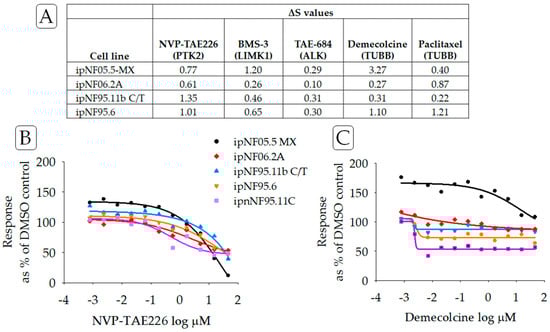 (A) ΔS scores for compounds targeting non-RAS proteins and reportedly binding or associated with neurofibromin. PTK2 (focal adhesion protein, FAK), TUBB (tubulin), LIMK1 (LIM Domain Kinase 1), and ALK (anaplastic lymphoma kinase). (B) Concentration–response curves for NVP-TAE226, an inhibitor of FAK, and (C) demecolcine, an inhibitor of tubulin. Lines in purple indicated data from the reference cell line ipnNF95.11C.