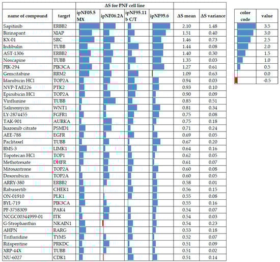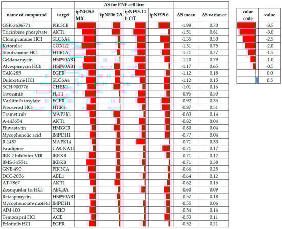Compounds with partial or low efficacy can represent important modulators of biological activity and may be particularly difficult to recognize based on AC50 analysis only. The use of ΔS may help to identify promising compounds that display partial effectiveness. The use of ΔS mean outcomes from multiple cell lines, as used here, may help in addressing drugs that generate partial responses in vitro and help address the known heterogeneity found in tumor cells and tumor cell lines in general [55,56,57]. DREA can be used to assess candidate compounds individually by the cell line, as in Figure 5 and Figure 6. This allows an analysis to reflect the molecular heterogeneity of different cell lines. In the development of treatments, wide applicability of the treatment is vital. Therefore, we also assess the ΔS mean and variance values, reflecting responses of PNF1 cell lines as a group, with the goal of assuring biological relevance and approaching response uniformity across PNF1 cell lines.