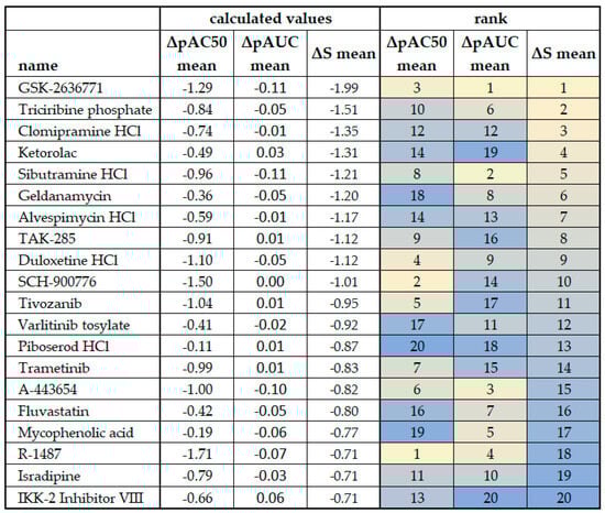 Since ΔS may be considered an alternative to AC50 and AUC-based methods, the Pearson product-moment correlation was used to compare outcomes from ΔS, ΔpAC50, and ΔpAUC (Figure 2B–D) from three MEK inhibitors (selumetinib, PD-0325901, and trametinib). No strong correlation was found for any pair of endpoints (ΔpAC50 and ΔpAUC, ΔpAC50 and ΔS, ΔpAUC and ΔS) across all plexiform neurofibroma cell lines. A moderate correlation was found, however, when comparing ΔpAC50 and ΔS for individual cell lines. This outcome could be largely anticipated as those endpoints measure different, albeit interrelated, components of the concentration–response curve (also see Supplemental Table S1). As an extension, no strong correlation was found when monitoring rank outcomes (see Section 3.4—Comparing Ranking Methodologies) from the ΔS mean, ΔpAC50 mean, and ΔpAUC mean, again suggesting that each endpoint is monitoring a different aspect of the concentration–response curves.