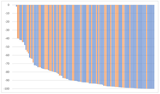 Maximum PSA reduction from baseline (group A: blue, group B: orange).
